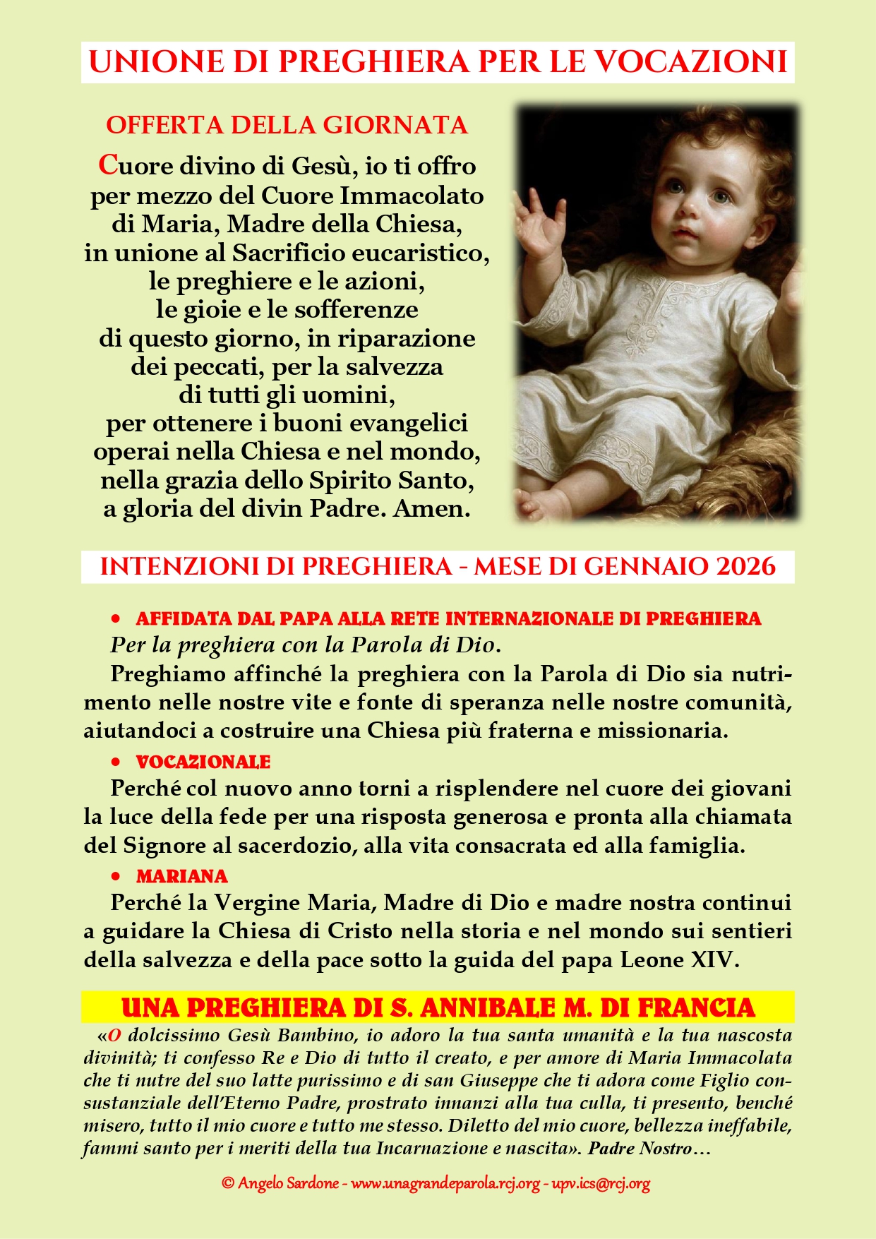 HOME UNA GRANDE PAROLA: ROGATE PREGATE DUNQUE IL SIGNORE DELLA MESSE PERCHÈ MANDI OPERAI NELLA SUA MESSE PORTALE DI INFORMAZIONE E COORDINAMENTO DELLE ASSOCIAZIONIUNIONE DI PREGHIERA PER LE VOCAZIONI - UPVUNIONE SACERDOTALE DI PREGHIERA PER LE VOCAZIONI - USPVUNIONE DI PREGHIERA PER LE VOCAZIONIStatuto UPV Regolamento UPV Come far parte Adesione Individuale UNIONE SACERDOTALE DI PREGHIERA PER LE VOCAZIONIStatuto USPV Regolamento USPV 60ª GIORNATA MONDIALE DI PREGHIERA PER LE VOCAZIONI30 APRILE 2023 SCARICA POLIEDRO ECCLESIALE SCARICA POLIEDRO PARROCCHIALE SCARICA MERAVIGLIOSO POLIEDRO ECCLESIALECENACOLI VOCAZIONALISiciliaCalabriaCampaniaPugliaMoliseLazioSiciliaGalati Mamertino Torrenova S. Stefano di Camastra S. Pier Marina Palermo CalabriaTrebisacce Oriolo Calabro Lamezia Terme CampaniaNapoli S. Bartolomeo in Galdo PugliaAltamura Modugno Bari Oria MoliseCampobasso LazioGrottaferrata ULTIME NOTIZIE INTENZIONI DI PREGHIERA MENSILE GENNAIO 2026 SCARICA INTENZIONI MENSILI ARCHIVIO INTENZIONI MENSILISUSSIDI ADORAZIONE MENSILE - GENNAIO 2026 SCARICA ADORAZIONE MENSILE ARCHIVIO ADORAZIONI MENSILIUNA PAGINA DI SPIRITUALITÀ ROGAZIONISTA - GENNAIO 2026 SCARICA LA PAGINA DI SPIRITUALITÀ ROGAZIONISTAESTRAZIONE DELLE POLIZZINE 2020 POLIZZINE 2020MESSA PROPRIA MESSA PROPRIALIBRETTO 1° LUGLIO 2018 LIBRETTO 1° LUGLIOLINK UTILI VOCAZIONI.NET QUMRAN2.netULTIME NOTIZIE INTENZIONI DI PREGHIERA MENSILE GENNAIO 2026 SCARICA INTENZIONI MENSILI ARCHIVIO INTENZIONI MENSILISUSSIDI ADORAZIONE MENSILE - GENNAIO 2026 SCARICA ADORAZIONE MENSILE ARCHIVIO ADORAZIONI MENSILIUNA PAGINA DI SPIRITUALITÀ ROGAZIONISTA - GENNAIO 2026 SCARICA LA PAGINA DI SPIRITUALITÀ ROGAZIONISTAESTRAZIONE DELLE POLIZZINE 2020 POLIZZINE 2020MESSA PROPRIA MESSA PROPRIALIBRETTO 1° LUGLIO 2018 LIBRETTO 1° LUGLIOLINK UTILI VOCAZIONI.NET QUMRAN2.netUNIONE DI PREGHIERA PER LE VOCAZIONIStatuto UPV Regolamento UPV Come far parte Adesione Individuale UNIONE SACERDOTALE DI PREGHIERA PER LE VOCAZIONIStatuto USPV Regolamento USPV 60ª GIORNATA MONDIALE DI PREGHIERA PER LE VOCAZIONI30 APRILE 2023 SCARICA POLIEDRO ECCLESIALE SCARICA POLIEDRO PARROCCHIALE SCARICA MERAVIGLIOSO POLIEDRO ECCLESIALECENACOLI VOCAZIONALISiciliaCalabriaCampaniaPugliaMoliseLazioSiciliaGalati Mamertino Torrenova S. Stefano di Camastra S. Pier Marina Palermo CalabriaTrebisacce Oriolo Calabro Lamezia Terme CampaniaNapoli S. Bartolomeo in Galdo PugliaAltamura Modugno Bari Oria MoliseCampobasso LazioGrottaferrata