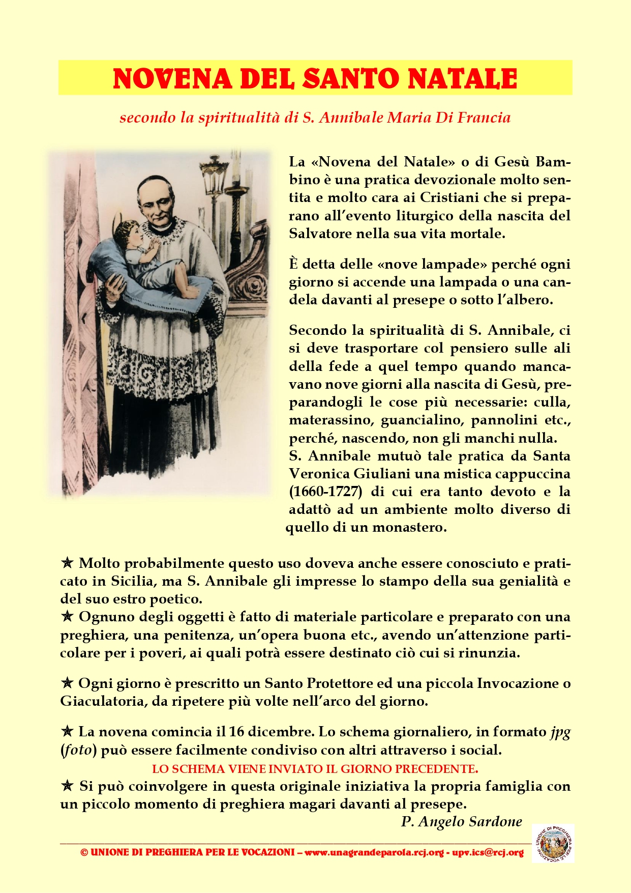 Dal momento che in alcune parti la Novena del Natale comincia il 15 dicembre ed in altre il 16, preferisco già da oggi pubblicare il materiale che può essere utile a fare un percorso di preparazione al Natale secondo lo spirito e la genialità devozionale di S. Annibale Maria Di Francia. Chiedo cortesemente pertanto di leggere con attenzione l’introduzione e l’avvertenza. La novena può essere diffusa liberamente presso conoscenti ed amici. Buona serata. P. Angelo Sardone